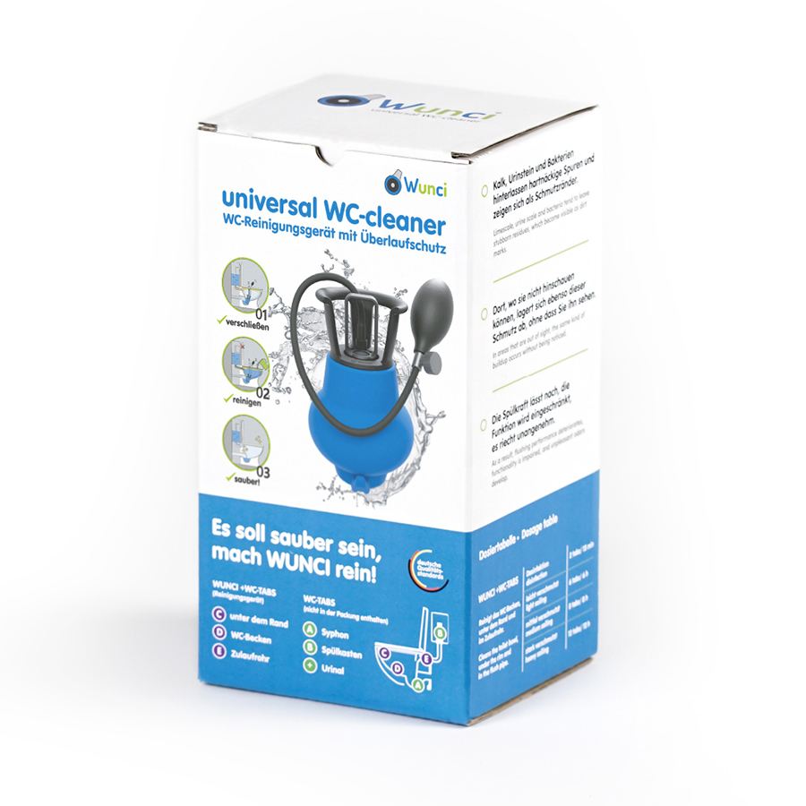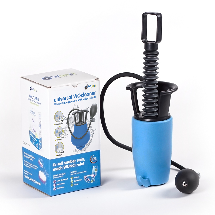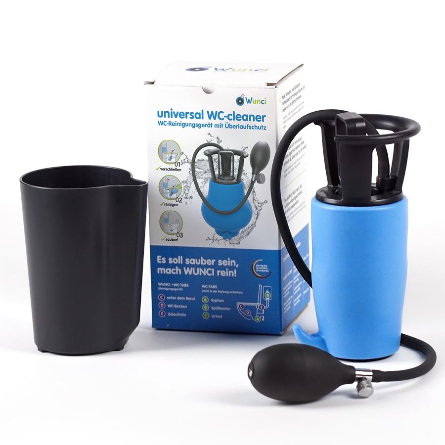 Wunci, das innovative Reinigungsgerät für Ihr Toilettenbecken! Speziell entwickelt, um Kalk, Schmutz und Urinstein mühelos zu entfernen, arbeitet Wunci in Kombination mit Wunci WC-Tabs oder Zitronensäure. Durch ein weiches aufblasbares Silikonelement wird der Siphon abgedichtet, wodurch sich Reinigungswasser stauen kann. Diese fortschrittliche Technik ermöglicht ein längeres Einweichen an schwer zugänglichen Stellen, sodass Ablagerungen ganz von selbst gelöst werden.